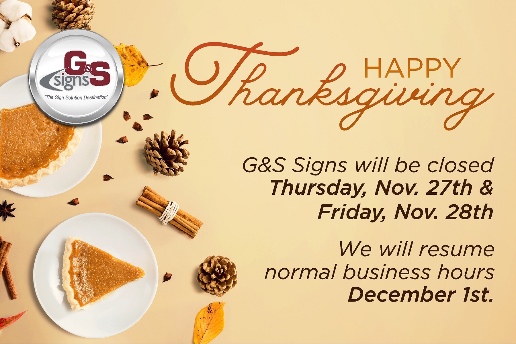 G&S Signs will be closed Thursday, November 27th and Friday, November 28th.